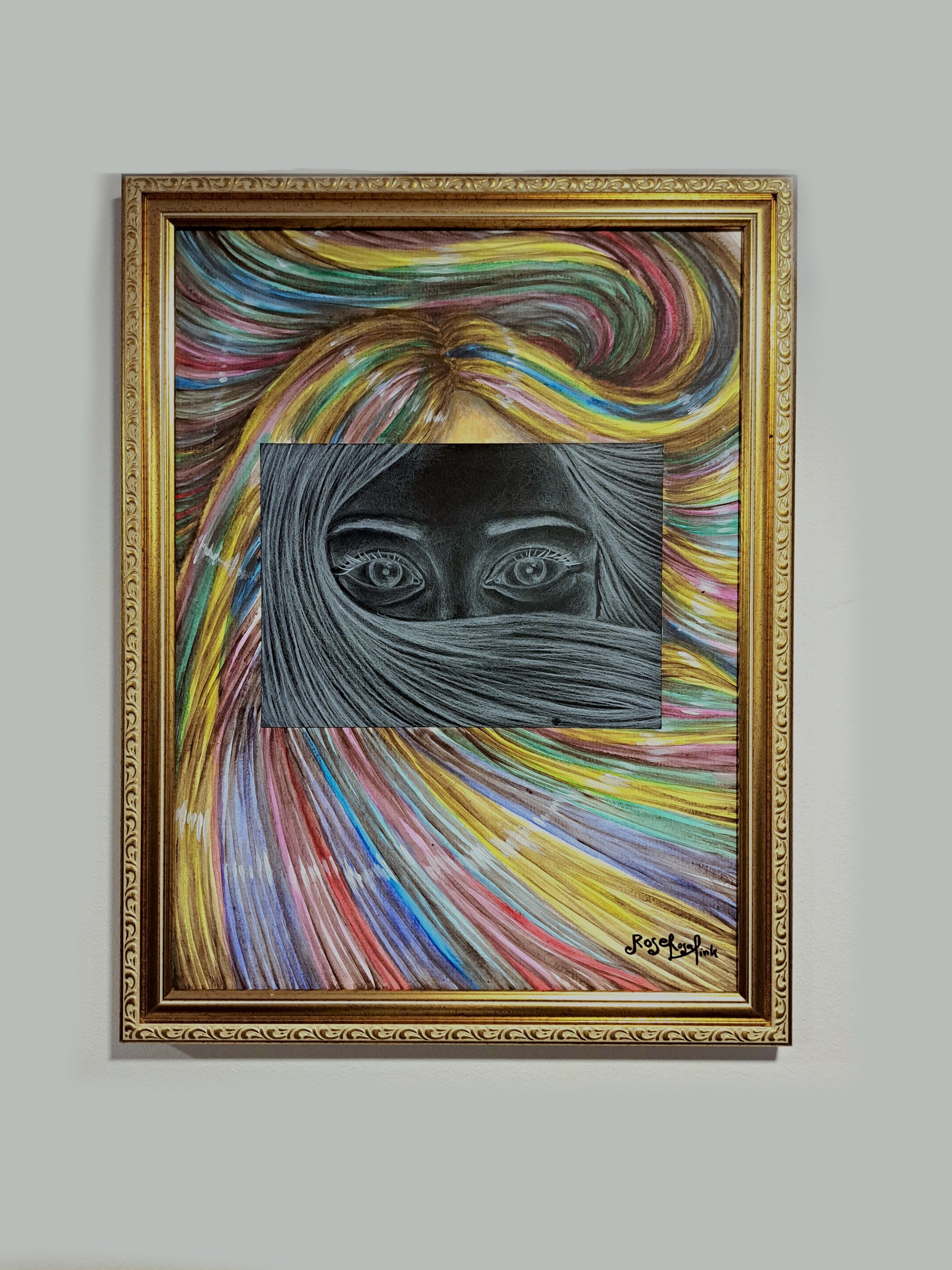 Acrylic on high quality poster. The black/white painting in the middle is on an additional paper painted with pencil. Size: 12"X16" (30 cm x 40 cm). The frame and a glossy varnish are without additional costs. Please let me know if you want the frame and if you want the painting to be varnished.